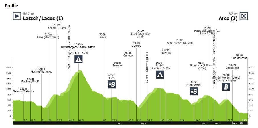 La tercera etapa, se disputará el miércoles 22 de abril, entre Latsch/Laces y Arco, sobre 174.5 kilómetros. Habrá dos puertos de montaña, uno de primera y el otro de segunda categoría, aunque distantes de la meta, que puede permitir un embalaje masivo.