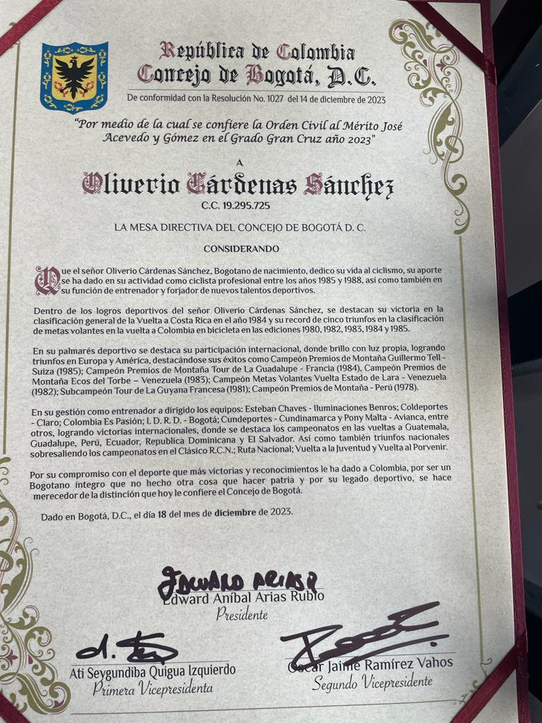El Concejo de Bogotá, condecoró a las glorias del ciclismo colombiano, Martín Ramírez y Oliverio Cárdenas, con la Orden “José Acevedo y Gómez”.