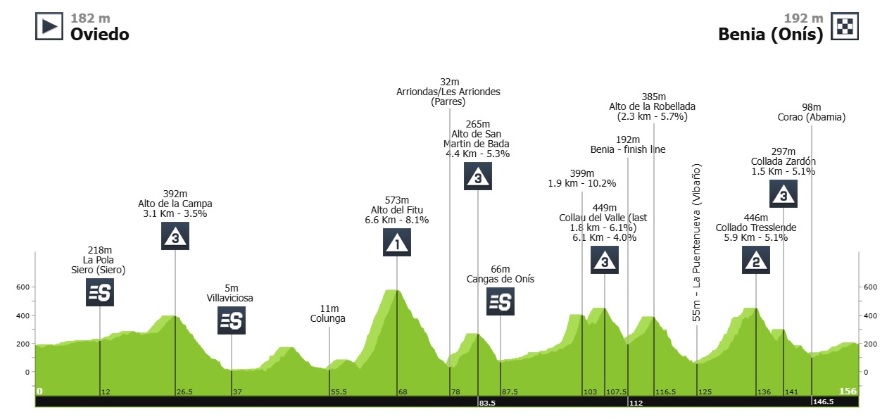 , jueves 23 de abril, entre Oviedo y Benia de Onís, sobre 155.5 kilómetros. Habrás seis puertos de montaña, cuatro de tercera, uno de primera categoría, y otro de segunda a 14 kilómetros de meta.