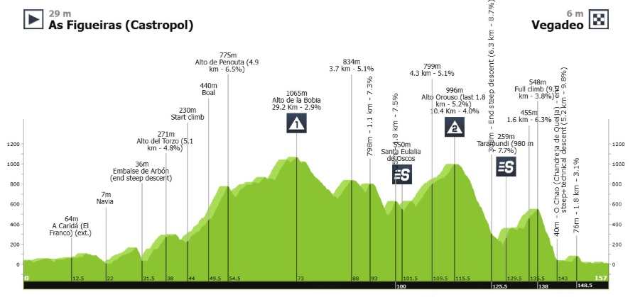 Tercera etapa, sábado 25 de abril, entre Figueras (Castropol) y Vegadeo, sobre 157.2 kilómetros. Habrá dos puertos de montaña, uno de primera y otro de segunda categoría.