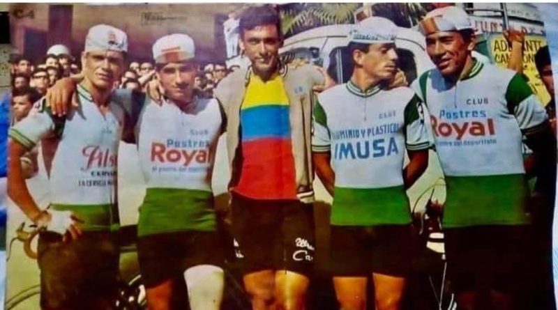Pléyade de ciclistas famosos que lucían orgullosos los uniformes de patrocinadores como Pilsen Cervunión, Imusa, y Postres Royal, en la afamada Vuelta a Colombia.
