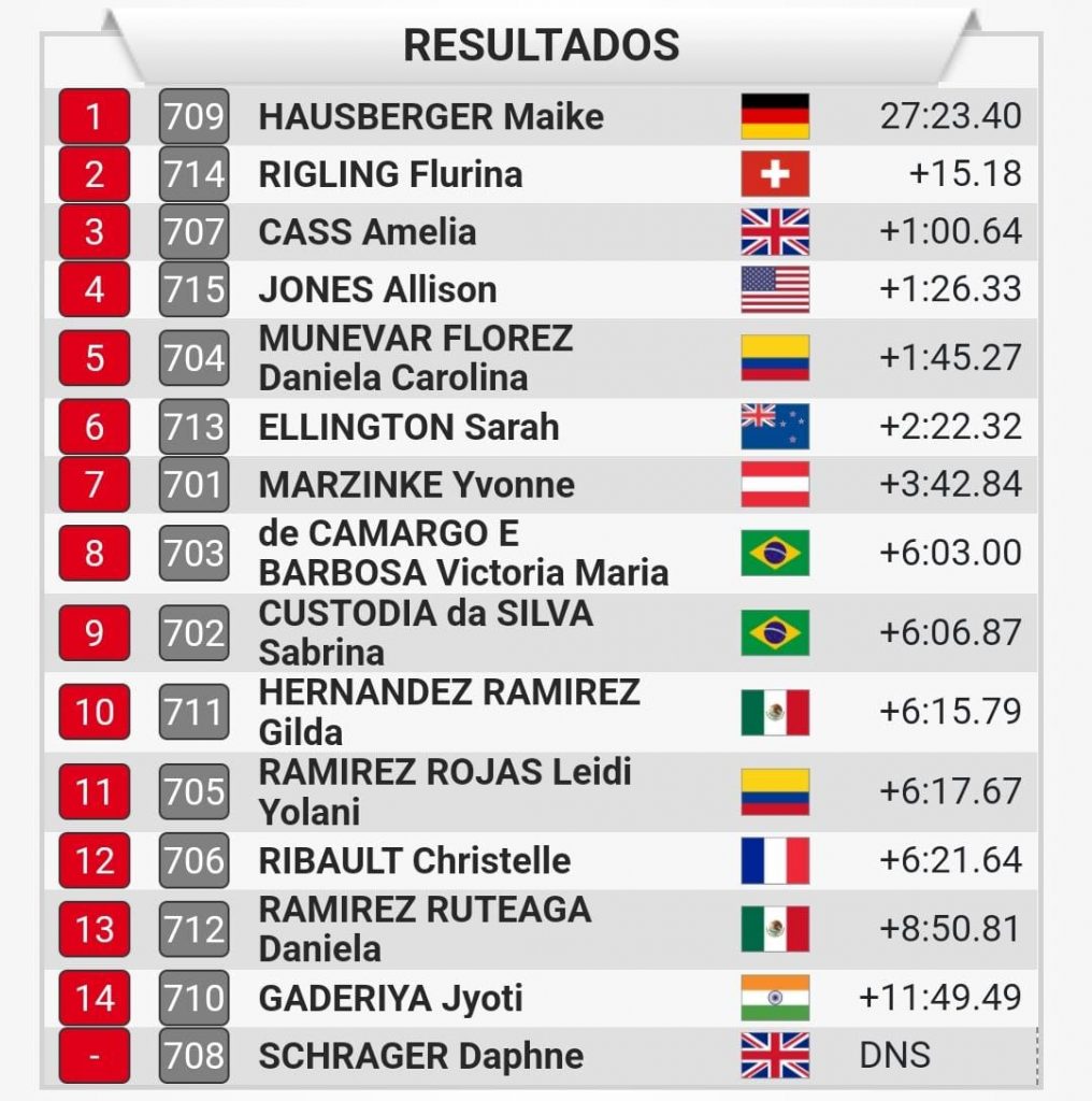 La carrera la ganó la alemana Maike Hausberguer; la medalla de plata fue para la suiza Flurina Rigling; mientas que la presea de bronce la consiguió la británica Amelia Cass.