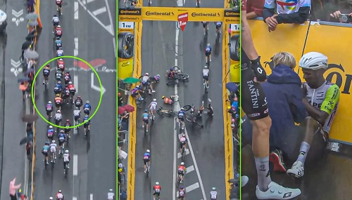 Tim Merlier, (Soudal Quick Step); Kaden Groves, (Alpecin Deceuninck); Tobias Johannessen, (Uno-X Mobility); Fred Wright, (Bahrain Victorious); y Biniam Girmay, (Intermarché Wanty), estuvieron en el incidente, siendo el mas afectado el eritreo quien fue atendido por el departamento médico y cruzó la meta seriamente afectado de su hombro derecho.