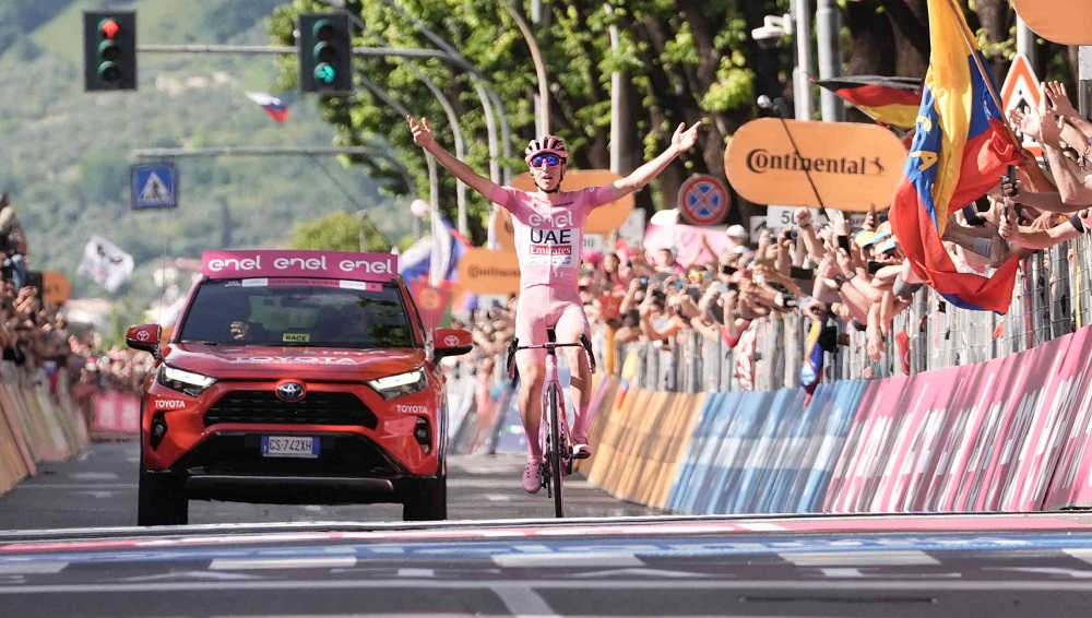 El virtual campeón del Giro 2024 recibió la felicitación y cariño de la ciclista eslovena Urska Zigart, su novia, quien estuvo en la llegada para apoyar a su próximo esposo, quien aprovechó el excelente trabajo de su equipo que mantuvo las escapadas controladas y en el último ascenso, a falta de 6 kilómetros para cruzar el último puerto puntuable, atacó sobrepasó al joven Giulio Pellizzari, (VF Group Bardani), quien era el único que quedaba de la fuga y acumuló los puntos que le permiten ser campeón de esta modalidad y luego hizo un descenso rápido pero seguro para incrementar la diferencia sobre su perseguidores y levantar los brazos por sexta ocasión en la competencia que culmina mañana.