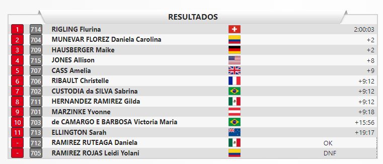 La boyacense Daniela Carolina Munévar finalizó en el segundo lugar en la ruta C2, que tuvo un recorrido de 62.4 kilómetros, a tan solo dos segundos de la campeona mundial, la suiza Flurina Rigling, que se llevó el arcoíris con un registro de dos horas y tres segundos (2:00:03).