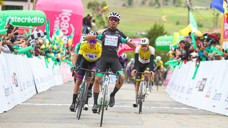 El ciclista de Boavita, Adrián Bustamante, (GW Erco Shimano), ganó al embalaje la primera etapa en línea de la Vuelta a Colombia 2024, que mantiene como líder al cundinamarqués Rodrigo Contreras, (NU Colombia).