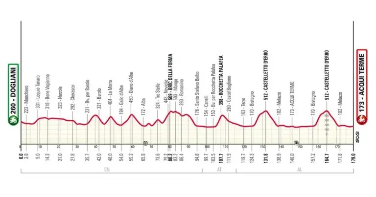 La carrera se disputará el jueves 9 de octubre y discurrirá sobre un recorrido de 179 kilómetros con salida en Dogliani y llegada en la localidad italiana de Acqui Terme. Los ascensos al Bric della Forma, Rocchetta Palafea y el doble paso por Castelletto d’Erro endurecerán la prueba.