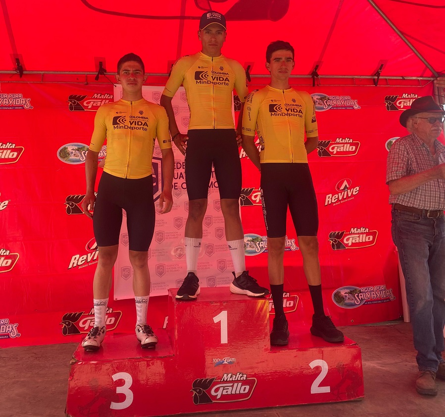 César Guavita se impuso en la tercera fracción de la Vuelta de la Juventud en Guatemala, escoltado por sus compañeros de equipo Camilo Castillo y Julián Alarcón.