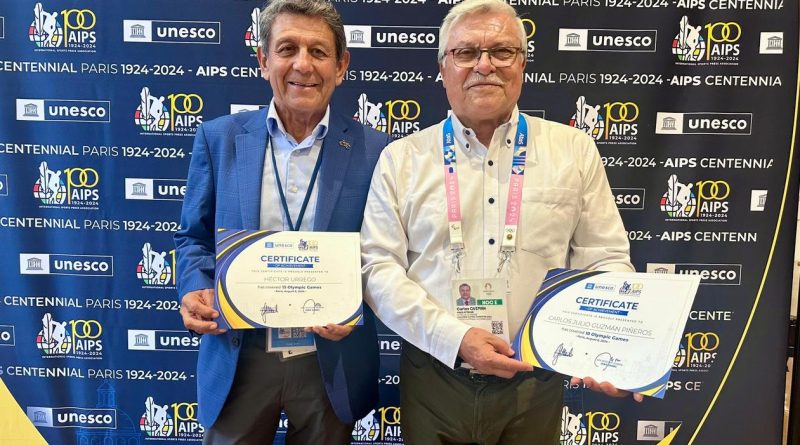 Paris 06 de agosto de 2024. -La celebración de los 100 años de la Asociación Internacional de Prensa Deportiva – AIPS tuvo lugar en la sede de la UNESCO, en París, en el marco de los Juegos Olímpicos, donde los Periodistas colombianos y miembros de Acord Bogotá, Héctor Urrego y Carlos Julio Guzmán, fueron reconocidos por su trayectoria en el Periodismo Deportivo, al contabilizar más de 10 cubrimientos de las justas multideportivas más importantes del planeta, los dos estuvieron acompañados de 112 colegas de los cinco continentes, escribiendo sus nombres en la conmemoración “Periodistas en el Podio” de la AIPS.