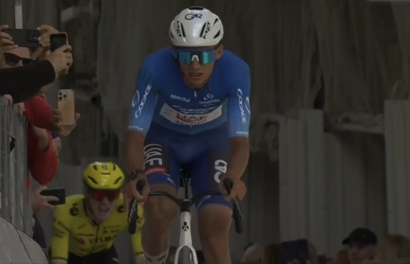 Los últimos kilómetros del ascenso fueron difíciles para el mexicano, lo atacó el belga Wout Van Aert, (Visma Lease a Bike); el irlandés Ben Healy, (EF Education – EasyPost); el italiano Giulio Pellizzari, (Red Bull Bora Hansgrohe), su principal rival que “arañó” su camiseta azul; y el estadounidense Matteo Jorgenson, (Visma Lease a Bike), que fue el último en tratar de vencerlo, pero a todos los fue “cazando”, hasta en los últimos metros sacar la fortaleza para cruzar solitario y consolidar su liderato.