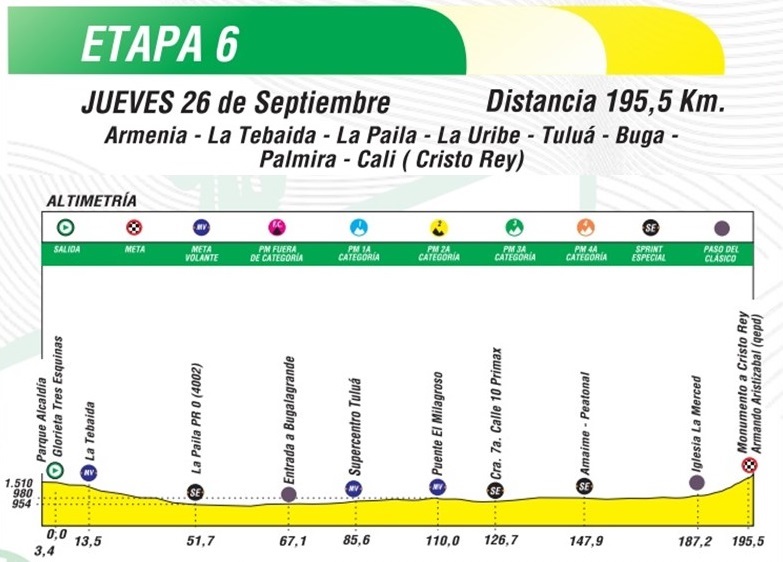 La sexta etapa se disputará el jueves 26 de septiembre, entre Armenia -la Tebaida La Paila – Tuluá – Palmira – Cali (Cerro las Tres Cruces homenaje a Armando Aristizabal), sobre 195,5 kilómetros. Jornada para embaladores.