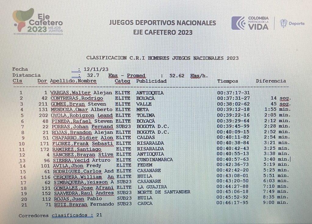 Un total de 21 ciclistas tomaron la largada y Vargas realizó el recorrido a un promedio de 52,62 kilómetros a la hora, dejando en el tercer lugar al representante del Valle, Bryan Gómez, quien obtuvo la medalla de bronce. Los representantes de Bogotá, Johan Porras y Brandon Rojas, culminaron séptimo y octavo, respectivamente.